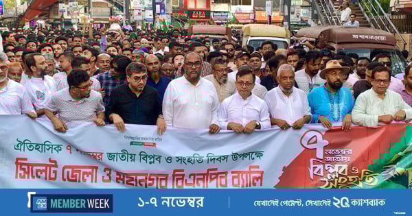 ঐতিহাসিক ৭ নভেম্বর জাতীয় বিপ্লব ও সংহতি দিবস উপলক্ষে সিলেট জেলা ও মহানগর বিএনপির উদ্যোগে বিশাল শোভাযাত্রা অনুষ্ঠিত হয়েছে। শুক্রবার বিকেল সাড়ে ৪টায় নগরীর কোর্ট পয়েন্ট থেকে শুরু হয়ে শোভাযাত্রাটি শহীদ মিনারে গিয়ে শেষ হয়।