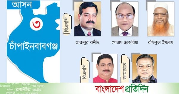 আসন্ন জাতীয় সংসদ নির্বাচনে চাঁপাইনবাবগঞ্জ-৩ (সদর) আসন থেকে বিএনপির চার নেতা মনোনয়ন দৌড়ে রয়েছেন। তাঁরা হলেন চেয়ারপারসনের উপদেষ্টা হারুনুর রশীদ, জেলা বিএনপির আহ্বায়ক গোলাম জাকারিয়া, সদস্যসচিব রফিকুল ইসলাম (চায়নিজ রফিক) ও চাঁপাইনবাবগঞ্জ চেম্বারের সভাপতি আবদুল ওয়াহেদ। প্রত্যেকেই নানাভাবে গণসংযোগ ও লবিং-তদবির চালিয়ে যাচ্ছেন।