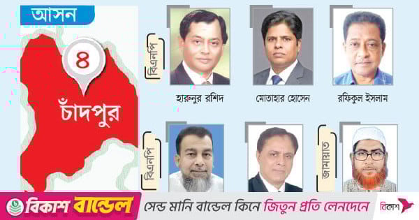 উপজেলার ১৫টি ইউনিয়ন ও একটি পৌরসভা নিয়ে চাঁদপুর-৪ (ফরিদগঞ্জ) আসনে বিএনপির মনোনয়নপ্রার্থী পাঁচ নেতা। ইতোমধ্যে জামায়াতে ইসলামী, ইসলামী আন্দোলন বাংলাদেশ ও জাতীয় পার্টি প্রার্থী চূড়ান্ত করেছে। বিএনপির মনোনয়নপ্রত্যাশীরা হলেন- দলের জাতীয় নির্বাহী কমিটির ব্যংকিং ও রাজস্ববিষয়ক সম্পাদক সাবেক এমপি লায়ন মো. হারুনুর রশিদ, জাতীয় নির্বাহী কমিটির সদস্য মোতাহার হোসেন পাটওয়ারী ও কে এম রফিকুল ইসলাম (কাজী রফিক), ফরিদগঞ্জ উপজেলা বিএনপির আহ্বায়ক আলহাজ এম এ হান্নান, জাতীয়তাবাদী কর আইনজীবী সমিতির সাবেক সভাপতি অ্যাডভোকেট আব্বাসউদ্দিন।