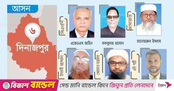 বিরামপুর, হাকিমপুর, নবাবগঞ্জ এবং ঘোড়াঘাট এই চার উপজেলা নিয়ে গঠিত দিনাজপুর-৬ আসনে বিএনপির সম্ভাব্য প্রার্থীরা হলেন- দলের স্থায়ী কমিটির সদস্য ও দলের চেয়ারপারসন খালেদা জিয়ার ব্যক্তিগত চিকিৎসক ডা. এ জেড এম জাহিদ হোসেন, জেলা বিএনপির সাবেক সহসভাপতি ও বর্তমান নবাবগঞ্জ উপজেলা বিএনপির উপদেষ্ঠা মো. মকবুলার রহমান গোর্কি। জামায়াতে ইসলামীর প্রার্থী জেলা জামায়াতের সাবেক আমির আনোয়ারুল ইসলাম, ইসলামী আন্দোলনের প্রার্থী দিনাজপুর দক্ষিণ জেলা সভাপতি ডা. নুর আলম সিদ্দিক, বাংলাদেশ খেলাফত মজলিসের প্রার্থী জেলা শাখার সহ-সভাপতি মুফতি নুরুল করিম, এবি পার্টির প্রার্থী দলের যুগ্ম সাধারণ সম্পাদক ব্যারিস্টার সানী আবদুল হক। এ ছাড়া জাতীয় পার্টি, এনসিপি,বাম ও নতুন দলের প্রার্থী কিংবা নেতা-কর্মীদের তেমন সাড়াশব্দ পাওয়া যাচ্ছে না। ডা. এ জেড এম জাহিদ হোসেন এরই মধ্যে দলকে সংগঠিত রাখতে এ আসনের চার উপজেলার নেতা-কর্মীদের সঙ্গে নিয়মিত বৈঠক করছেন এবং বিভিন্ন অনুষ্ঠনে উপস্থিত থাকছেন। মো. মকবুলার রহমান গোর্কি বলেন, ছাত্রাবস্থায় সাবেক ইউনিয়ন ও উপজেলা চেয়ারম্যানের দায়িত্ব পালন করেছি। বিএনপি মনোনয়ন দিলে সর্বস্তরের জনগণের সমর্থন পাব। আনোয়ারুল ইসলাম বলেন, চার উপজেলার মধ্যে তিনটি পৌরসভা, বাকি ঐতিহ্যবাহী নবাবগঞ্জ উপজেলাকে পৌরসভা করার জন্য আপ্রাণ চেষ্টা করব।