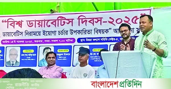 বিশ্ব ডায়াবেটিস দিবস ছিল গতকাল ১৪ নভেম্বর। ‘আসুন সুশৃঙ্খল জীবন যাপন করি, পরিবারকেও ডায়াবেটিসমুক্ত রাখি’ এ স্লোগানে রাজধানীর উত্তরার ৪ নম্বর সেক্টর পার্কে উত্তরা ইয়োগা সোসাইটি ‘ডায়াবেটিস নিরাময়ে ইয়োগাচর্চার উপকারিতা’বিষয়ক আলোচনা সভার আয়োজন করে। অনুষ্ঠানে প্রধান অতিথি ছিলেন ইন্ডাস্ট্রিয়াল পুলিশের অতিরিক্ত আইজি গাজী জসিম, বিশেষ অতিথি ছিলেন বাংলাদেশ প্রতিদিনের নির্বাহী সম্পাদক মন্জুরুল ইসলাম। সভাপতিত্ব করেন উত্তরা কল্যাণ সমিতি সেক্টর-৪-এর সভাপতি মেজর (অব.) আনিসুর রহমান। প্রধান আলোচক ছিলেন ন্যাচারাল মেডিসিন ও বয়স্ক রোগ বিশেষজ্ঞ ডা. মো. আমান উল্লাহ।