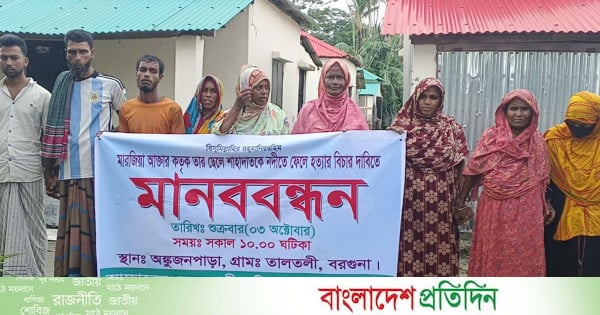শুক্রবার (৩ অক্টোবর) বেলা ১১টায় উপজেলার বড় অঙ্কুজানপাড়া এলাকায় অনুষ্ঠিত মানববন্ধনে কয়েকশ নারী-পুরুষ অংশ নেন। তারা বলেন, “একজন মা হয়ে সন্তানের এমন নির্মম হত্যাকাণ্ড কোনোভাবেই মেনে নেওয়া যায় না। হত্যাকারীর দৃষ্টান্তমূলক শাস্তি নিশ্চিত করতে হবে।”