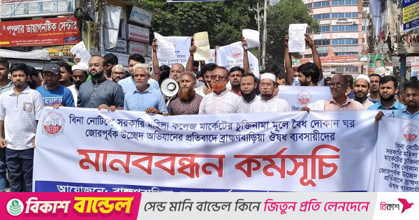 ব্রাহ্মণবাড়িয়া সরকারি মহিলা কলেজ মার্কেটের চুক্তিনামা অনুযায়ী বৈধ দোকানঘর ‘জোরপূর্বক’ উচ্ছেদ অভিযানের প্রতিবাদে মানববন্ধন ও বিক্ষোভ মিছিল করেছেন ওষুধ ব্যবসায়ীরা।