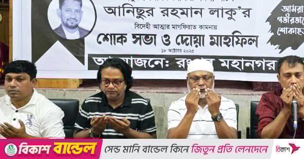 রংপুর জেলা বিএনপির সদস্য সচিব আনিছুর রহমান লাকুর আত্মার মাগফিরাত কামনা করে দোয়া মাহফিল করেছে মহানগর যুবদল। দলীয় কার্যালয়ে শনিবার (১৮ আক্টোবর) দুপুরে দোয়া মাহফিল অনুষ্ঠিত হয়।