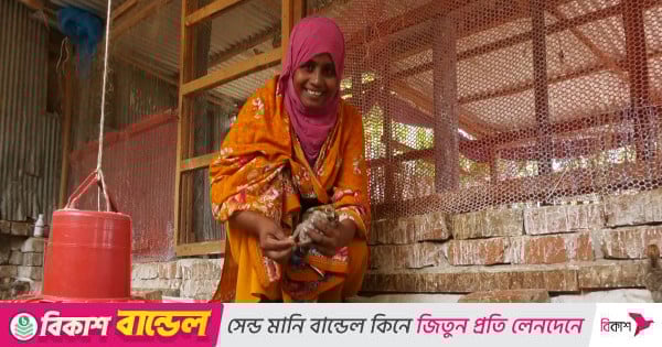 বাড়ির সামনে একটি টিনের ঘর। সেখানে আলাদা আলাদা করে রাখা হয়েছে কয়েক জাতের মুরগির বাচ্চা। আর তা দেখভাল করছেন নারী উদ্যোক্তা খুশি খাতুন। কখনো খাবার দিচ্ছেন আবার কখনো মুরগিগুলোর স্বাস্থ্য পরীক্ষা করছেন।