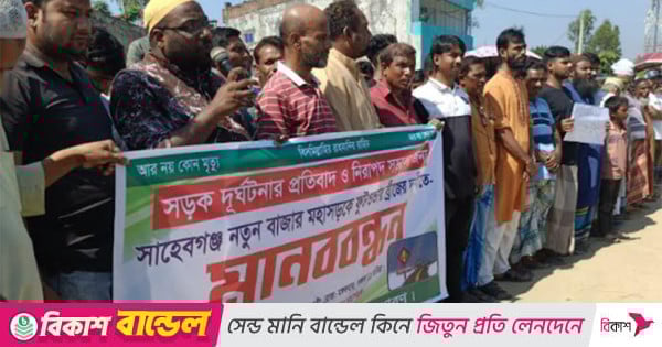 সাহেবগঞ্জ বাজার কমিটির সভাপতি আব্দুল মোমিন সরকারের সভাপতিত্বে মানববন্ধন কর্মসূচিতে বক্তব্য রাখেন বিএনপি নেতা ভিপি আয়নুল হক, ইঞ্জিনিয়ার সাব্বির আহমেদ ও নলকা ইউনিয়ন পরিষদের প্যানেল চেয়ারম্যান রেজাউল করিম প্রমুখ।