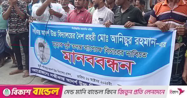 কুড়িগ্রামের লক্ষ্মীকান্ত আর্দশ উচ্চ বিদ্যালয়ের নৈশ প্রহরি আনিছুর রহমানের (৩৫) রহস্যজনক মৃত্যুর সুষ্ঠু তদন্ত ও বিচারের দাবিতে মানববন্ধন ও বিক্ষোভ মিছিল অনুষ্ঠিত হয়েছে। দুপুরে সদর উপজেলার ভোগডাঙ্গা ইউনিয়নের লক্ষ্মীকান্ত আর্দশ উচ্চ বিদ্যালয়ের সামনে এ মানববন্ধন ও বিক্ষোভ করে এলাকাবাসী। এতে অংশ নেয় নিহতের পরিবারসহ শত শত নারী পুরুষ।