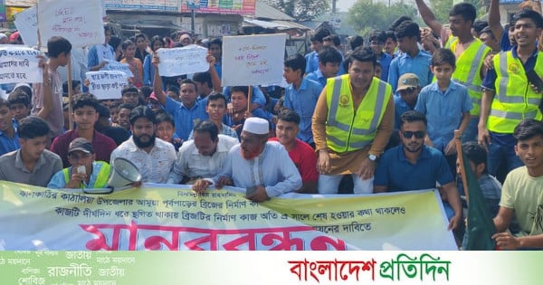 মানববন্ধনে বক্তারা অবিলম্বে ব্রিজের কাজ সম্পন্ন করার আহ্বান জানান।