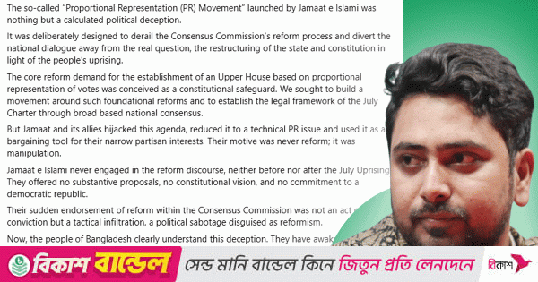 নাহিদ ইসলাম বলেন, জামায়াতে ইসলামী পিআর পদ্ধতি নিয়ে যে তথাকথিত আন্দোলন শুরু করেছিল, আসলে সেটি ছিল এক সুচিন্তিত রাজনৈতিক প্রতারণা। সেই আন্দোলন পরিকল্পিতভাবে করা হচ্ছিল ঐকমত্য কমিশনের সংস্কার প্রক্রিয়া ও জাতীয় আলোচনাকে গণঅভ্যুত্থানের পর রাষ্ট্র ও সংবিধান পুনর্গঠনের আসল প্রশ্ন থেকে ভিন্নখাতে প্রবাহিত করতেই।