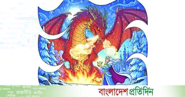 এক সময়ের কথা, ঘন অরণ্যে ঘেরা এক রাজ্যে আকাশচুম্বী পাইন গাছের মাথায় জমে থাকত সাদা বরফের চাদর। রাজপ্রাসাদের চূড়ায় জ্বলত একটি জাদুকরী মুকুট, রাজকুমার আলেকজান্ডারের মাথায় যার আলোয় ফুটে উঠত ঋতুর রং। কিন্তু এক রাতেই সব বদলে গেল! এক দানবীয় ড্রাগন, যার চোখ জ্বলজ্বল করত লাল আগুনের মতো, মুকুটটি ছিনিয়ে নিয়ে গেল গভীর গুহায়। রাজ্য ধীরে ধীরে জমে যেতে লাগল বরফে, গাছের পাতা ঝরে পড়ল, নদী জমে হলো বরফের সড়ক। রাজকুমারী এলিসা, যার চুল সোনালি রোদের মতো উজ্জ্বল, শপথ নিল, ‘আমি মুকুট ফিরিয়ে আনব, নইলে আমার ভাইয়ের প্রাণ যাবে!’ পথ দেখাল এক জ্ঞানী কাক, কালো পালকে মোড়া, যে কথা বলতে পারত মানুষের ভাষায়। কাক বলল, ‘ড্রাগনের গুহায় যাওয়ার পথে তিনটা পরীক্ষা পার হতে হবে। হার মানলে তুমি চিরতরে পাথর হয়ে যাবে!’