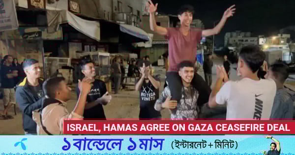 ইসরায়েল ও হামাসের এই যুদ্ধবিরতি চুক্তি সই করার খবর প্রকাশ্যে আসার পর গাজার খান ইউনিসে উল্লাস করতে দেখা গেছে ফিলিস্তিনি যুবকদের।