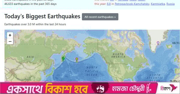 ২৪ ঘণ্টায় বিশ্বের বিভিন্ন স্থানে ৯৪টি ভূমিকম্প রেকর্ড করেছে ভূমিকম্প মনিটরিং ওয়েবসাইট আর্থকোয়াকট্র্যাকার ডটকম। শুক্রবারের কম্পনের রেশ কাটতে না কাটতেই শনিবার রাজধানী ও আশপাশে ৮ ঘণ্টার ব্যবধানে আরও তিনবার মৃদু কম্পন অনুভূত হওয়ায় উদ্বেগ বেড়েছে।