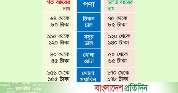 তথ্য বিশ্লেষণ করে দেখা গেছে, প্রতি কেজি চিকন চাল ৭৫ থেকে ৮৫ টাকা। যা গত বছর বিক্রি হয়েছিল ৬৪ থেকে ৮০ টাকা। এই হিসাবে প্রতি কেজি চিকন চালের দাম বেড়েছে ৫ থেকে ১১ টাকা। মাঝারি মানের চাল কেজিতে ৫ থেকে ১০ টাকা বেড়ে ৬০ থেকে ৭০ টাকায় বিক্রি হচ্ছে। মোটা চাল কেজিতে ৫ টাকা বেড়ে ৫৫ থেকে ৬০ টাকায় বিক্রি হচ্ছে। মোটা ডালের দাম কিছুটা কমলেও মাঝারি ও ছোট দানার ডালের দাম বেড়েছে।