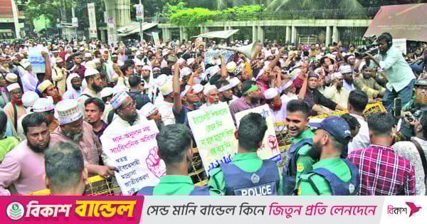 জাতীয়করণের দাবিতে গতকাল জাতীয় প্রেস ক্লাবের সামনের সড়ক অবরোধ করে বিক্ষোভ করেছেন স্বতন্ত্র ইবতেদায়ি মাদরাসার শিক্ষকরা। দুপুর ১২টার পর তাঁরা পল্টন থেকে হাই কোর্টগামী রাস্তায় বসে-শুয়ে বিক্ষোভ করতে থাকেন। তাঁদের অবস্থানের কারণে আটকে যায় যান চলাচল, তৈরি হয় ব্যাপক ভোগান্তির। এদিকে শিক্ষা উপদেষ্টার বিরুদ্ধে ‘অসম্মানজনক আচরণ’-এর অভিযোগ তুলে তাঁর পদত্যাগ দাবি করেছে স্বতন্ত্র ইবতেদায়ি মাদরাসা শিক্ষক ঐক্য জোট। দাবির পক্ষে সচিবালয়ে স্মারকলিপি জমা দিতে গিয়ে শিক্ষা উপদেষ্টার সঙ্গে সাক্ষাৎ না পাওয়ায় জোটের নেতারা এ ক্ষোভ প্রকাশ করেন। পরে তাঁরা আজ সকালে জাতীয় প্রেস ক্লাবের সামনে বিক্ষোভ মিছিলের ঘোষণা দেন। বেলা ৩টায় তাঁরা সড়ক থেকে সরে প্রেস ক্লাবের সামনের ফুটপাতে অবস্থান নিলে যান চলাচল শুরু হয়। অনুদানভুক্ত ও অনুদানবিহীন সব স্বতন্ত্র ইবতেদায়ি মাদরাসা পর্যায়ক্রমে জাতীয়করণ ঘোষণার দ্রুত বাস্তবায়নসহ পাঁচ দাবিতে গতকাল শিক্ষা মন্ত্রণালয় অভিমুখে পদযাত্রা করেন ইবতেদায়ি শিক্ষকরা। দুপুর সাড়ে ১২টার পর জাতীয় প্রেস ক্লাবের সামনে থেকে তাঁরা পদযাত্রা করলে পুলিশ কদম ফোয়ারা এবং প্রেস ক্লাবের মাঝামাঝি স্থানে আটকে দেয়। আটকে দেওয়ার পর শিক্ষকরা রাস্তায় বসে-শুয়ে বিক্ষোভ করতে থাকেন। পরে স্বতন্ত্র ইবতেদায়ি মাদরাসা শিক্ষক ঐক্য জোটের চেয়ারম্যান কাজী মোখলেছুর রহমানসহ ১৫ সদস্যের একটি প্রতিনিধিদল শিক্ষা মন্ত্রণালয়ে স্মারকলিপি জমা দিতে যান। কিন্তু তাঁরা শিক্ষা উপদেষ্টার সাক্ষাৎ পাননি। কাজী মোখলেছুর রহমান বলেন, ‘শিক্ষা উপদেষ্টার কার্যালয়ে যাওয়ার পর শিক্ষা উপদেষ্টা রেসপেক্ট ও রেসপন্স তো দূরের কথা, সৌজন্যমূলক আচরণ পর্যন্ত আমাদের সঙ্গে করেননি। আমাদের সঙ্গে সাক্ষাৎ না করে অসম্মানজনক আচরণ দেখিয়ে আমাদের বিদায় করে দিয়েছেন।’ এ ধরনের আচরণের কারণে শিক্ষা উপদেষ্টার পদত্যাগ দাবি করেন তিনি।