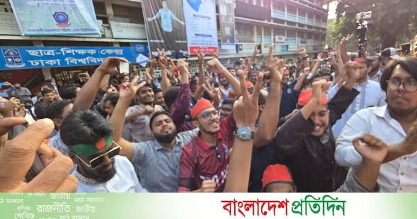 এসময় 'এ মুহূর্তে খবর এলো, শেখ হাসিনার ফাঁসি হলো', 'দড়ি লাগলে দড়ি নে, শেখ হাসিনার ফাঁসি দে'- স্লোগান দিতে থাকেন জনতা।