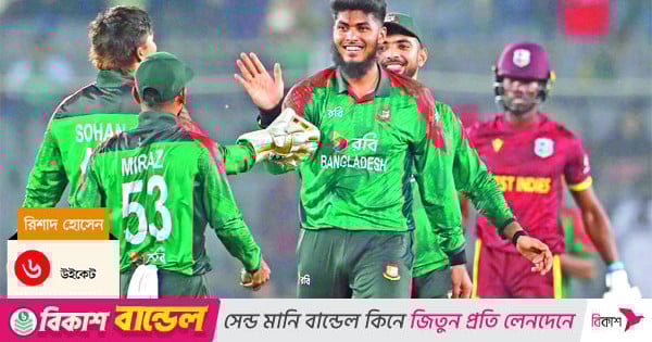 ওয়েস্ট ইন্ডিজ ইনিংসের ৩৯তম ওভারের শেষ বলটি অফ স্ট্যাম্পের বাইরে ফেলেন রিশাদ হোসেন। গুগলি বলটি হালকা টার্নে বেরিয়ে যাওয়ার মুখে ড্রাইভ খেলেন জায়দান সিলস। বল ব্যাটের কানায় লেগে প্রথম স্লিপে অধিনায়ক মেহেদি হাসান মিরাজের তালুবন্দি হয়। সিলস আউট। অলআউট ওয়েস্ট ইন্ডিজ। সিলসের উইকেটটি ছিল রিশাদের ম্যাচের ৬ নম্বর উইকেট। দীর্ঘকায় রিশাদের লেগ স্পিনের মায়াবী জালে ৩৯ ওভারে ক্যারিবীয়রা অলআউট মাত্র ১৩৩ রানে। মিরপুরের রহস্যময় কালো মাটির উইকেটে ৭৪ রানে বাংলাদেশ তুলে নেয় সহজ জয়। এই জয়ে তিন ম্যাচ ওয়ানডে সিরিজে এগিয়েই যায়নি টাইগাররা, নেতৃত্বের দোলাচলে দুলতে থাকা অধিনায়ক মিরাজ হাঁফ ছেড়ে বাঁচেন। ২১ অক্টোবর দ্বিতীয় ম্যাচটি বাংলাদেশ যদি জিতে যায়, তাহলে এ যাত্রায় নেতৃত্বও বেঁচে যাবে মিরাজের। অধিনায়ক মিরাজ ১১ ম্যাচে মাত্র দ্বিতীয় জয় পেয়েছেন। সব মিলিয়ে সর্বশেষ ১৩ ম্যাচে বাংলাদেশের এটা দ্বিতীয় জয়। বাংলাদেশের প্রথম স্পিনার হিসেবে রিশাদ ৬ উইকেট নেন এক ম্যাচে। এর আগে স্পিনার হিসেবে সেরা বোলিং স্পেল ছিল বাঁহাতি স্পিনার তাইজুল ইসলামের, ২০২২ সালের জুলাইয়ে প্রোভিডেন্সে ওয়েস্ট ইন্ডিজের বিপক্ষে ২৮ রানে ৫ উইকেট নিয়েছিলেন। টাইগারদের সেরা বোলিং স্পেল সাবেক অধিনায়ক মাশরাফি বিন মর্তুজার কেনিয়ার বিপক্ষে ২৬ রানে ৬ উইকেট ২০০৬ সালে নাইরোবিতে। মিরপুরে সেরা বোলিং পেসার রুবেল হোসেনের নিউজিল্যান্ডের বিপক্ষে ২০১৩ সালে ২৬ রানে ৬ উইকেট। ম্যাচসেরা রিশাদের বোলিং স্পেল ৯-০-৩৫-৬।
