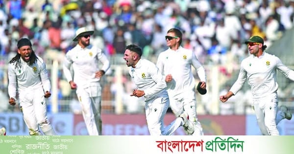 টেস্ট যে তিন দিনের বেশি গড়াবে না, দ্বিতীয় দিনেই নিশ্চিত হয়ে গিয়েছিল। প্রথম দিন ইডেনের উইকেটে বল ঘুরছিল। দ্বিতীয় দিন লাটিমের মতো ঘুরেছে। গতকাল শেষ হয়ে গেছে। অবশ্য ভারতের নিয়মিত অধিনায়ক শুভমান গিল ব্যাটিং করতে পারেননি। ঘাড় শক্ত হয়ে যাওয়ায় ব্যাটিং করেননি। ভারতকে নেতৃত্ব দেন উইকেটরক্ষক ব্যাটার ঋশভ পান্থ। এমন উইকেটে জশপ্রীত বুমরাহর গতিতে নাকাল হয়ে সফরকারী প্রোটিয়ারা ১৫৯ রানে গুটিয়ে যায়। ভারত ১৮৯ রান করে। ৩০ রানে পিছিয়ে দ্বিতীয় ইনিংসে অধিনায়ক টেম্বা বাভুমার অপরাজিত ৫৫ রানে ভর করে ১৫৩ রান করে। টার্গেট মাত্র ১২৪ রান। ঘরের মাঠ, পরিচিত উইকেটে এমন টার্গেট আকাশছোঁয়া নয়। ম্যাচসেরা হারমারের ঘূর্ণিতে ৩৫ ওভারে ৯৩ রানে গুটিয়ে যায় ভারত। বাঁ-হাতি স্পিনার কেশব মহারাজ ৩৪.৫ ও ৩৫.৬ বলে উইকেট নিয়ে হ্যাটট্রিকের আশা জাগিয়ে ছিলেন। এজন্য ২২ নভেম্বর গুয়াহাটিতে শুরু দ্বিতীয় টেস্টে নিজের প্রথম বলেই উইকেট নিতে হবে মাহরাজকে। ম্যাচসেরা হারমার প্রথম ইনিংসে ৩০ রানে ৪টি ও দ্বিতীয় ইনিংসে ২১ রানে নেন ৪ উইকেট।