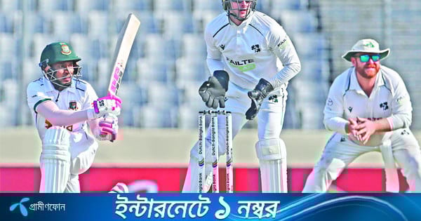 সিলেটে ইনিংস ও ৪৭ রানে জয়ী হয়ে সিরিজে এগিয়ে রয়েছে নাজমুল বাহিনী। মিরপুরে জিতলে হোয়াইটওয়াশ করবে আইরিশদের। মুশফিকের শততম টেস্টকে রাঙাতে একাদশে দুটি পরিবর্তন করেন টিম ম্যানেজমেন্ট। দুই পেসার নাহিদ রানা ও হাসান মাহমুদের বদলে সুযোগ পান এবাদত হোসেন ও সৈয়দ খালেদ আহমেদ। বাংলাদেশ টেস্ট খেলছে ২৫ বছর হয়ে গেছে। ২৬ বছরে পা দিয়েছে চলতি নভেম্বরে। নতুন বছরে দ্বিতীয় টেস্ট খেলছে মিরপুরে। গতকাল মুশফিকের শততম টেস্টে টস জেতেন অধিনায়ক নাজমুল। টেস্টের শেষের দিকে বল ঘুরবে বলে আগে ব্যাটিং করেন। দুই ওপেনার সাদমান ইসলাম ও মাহমুদুল হাসান জয় ৫২ রানের জুটি গড়েন। প্রথম টেস্টে ১৬৯ রানের ইনিংস খেলা জয় আউট হন ৩৪-এ। সাদমান আউট হন ৩৫ রানে। প্রথম টেস্টে ১০০ রানের ইনিংস খেলা টাইগার অধিনায়ক নাজমুল আউট হন ব্যক্তিগত ৮ রানে। ৯৫ রানে ৩ উইকেট হারানোর পর জুটি গড়েন মুমিনুল ও বাংলাদেশের প্রথম ক্রিকেটার হিসেবে শততম টেস্ট খেলতে নামা মুশফিক। দুজনে ৩৫.৪ ওভারে যোগ করেন ১০৭ রান। মুমিনুল ৬৩ রানের ইনিংস খেলে অ্যান্ডি ম্যাকব্রাইনের চতুর্থ শিকার হন। টাইগার ইনিংসের ৪ উইকেটই নেন ম্যাকব্রাইন। মুমিনুলের ১২৮ বলের ইনিংসটিতে ছিল মাত্র ১টি চার। সাবেক অধিনায়ক সাজঘরে ফেরেন দলীয় ২০২ রানে। এরপর মুশফিক জুটি গড়েন টি-২০ অধিনায়ক লিটনের সঙ্গে। দুজনে পঞ্চম উইকেটে ৯০ রানের অবিচ্ছিন্ন জুটি গড়ে দিন পার করেন। মুশফিক ৯৯ রানের অপরাজিত ইনিংস খেলেন ১৮৭ বলে ৫ চারে সাজিয়ে। প্রথম হাফ সেঞ্চুরি করেন ৯৩ বলে এক চারে। পরের ৪৯ রান করেন ৯৭ বলে ৪ চারে। লিটন ৪৭ রানের অপরাজিত ইনিংস খেলেন ৮৬ বলে ২ চারে। মিরপুর টেস্টে প্রথম দিনে টাইগারদের ইনিংসের একমাত্র ছক্কাটি মারেন অধিনায়ক নাজমুল। ব্যাটাররা চার মারেন ১৬টি।