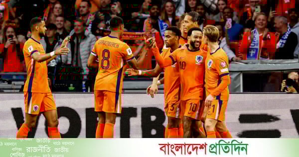 বিশ্বকাপ বাছাইপর্বের ‘জি’ গ্রুপের ম্যাচে নেদারল্যান্ডস ৪-০ গোলে হারিয়ে দিয়েছে ফিনল্যান্ডকে। র্যাঙ্কিংয়ে পিছিয়ে থাকা ফিনল্যান্ড পুরো ম্যাচে ডাচদের সামনের কোনো প্রতিরোধ গড়ে তুলতে পারেনি। এই জয়ে ২০২৬ সালের বিশ্বকাপের বাছাইয়ে আরও এক ধাপ এগিয়েছে নেদারল্যান্ডস।